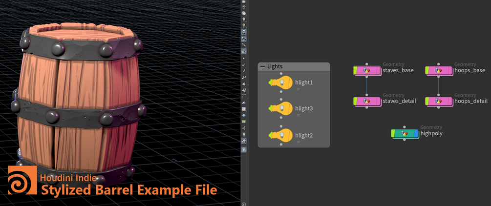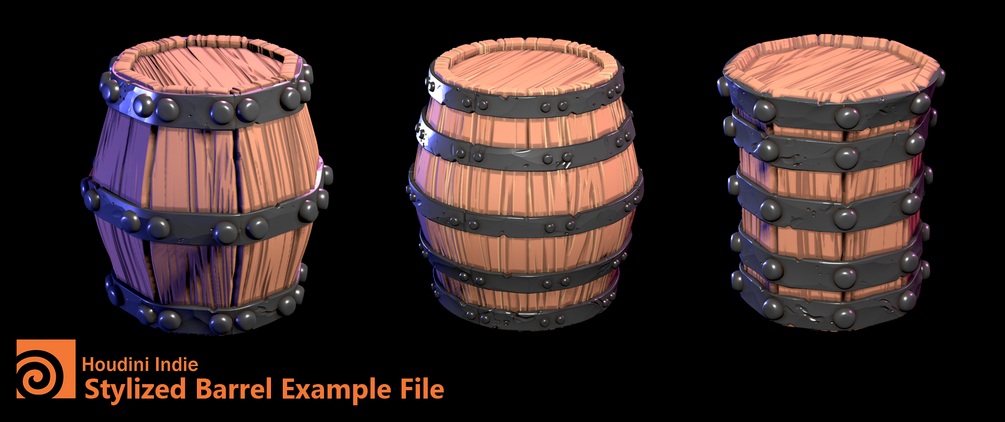 A fun network demonstrating how to create a 100% procedural stylized barrel. Contains comments and colorization of different areas of logic, and is a great example of: