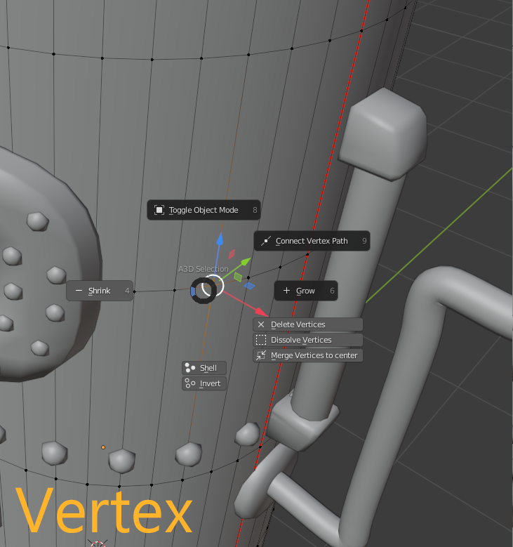 - Delete / Dissolve / Merge to center: Shortcuts to default blender behavior to delete a vertex and it's surrounding faces, remove a vertex while leaving it's surroundings intact and merging selected vertices to their center point.