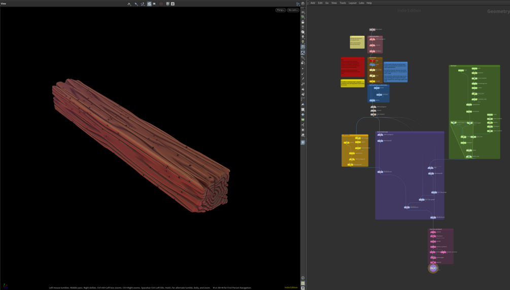 Includes an example of how to take a simple box and use a mix of VEX, VDBs and Math to create fun wood grain details. The network contains comments and color blockouts to make it easier to follow what each section is doing.
